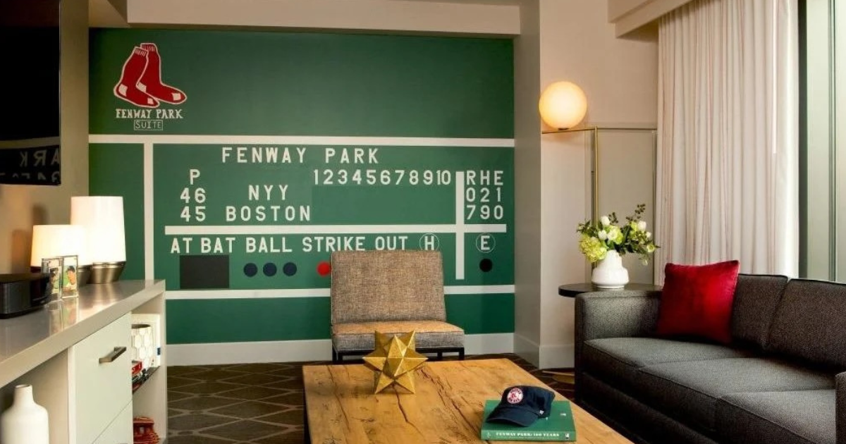 Hotel Commonwealth is a well-known 245-guestroom luxury property in Boston, Massachusetts, just steps from the historic Fenway Park and Kenmore Square. It’s recognized for its ability to capture a balance between spirited urban Boston energy and a location that features a quiet residential mood. Large, light-filled guest rooms and on-site dining options, including the legendary Blue Ribbon Sushi and Row 34—a vivacious, neighborhood-focused seafood restaurant and oyster bar—make for an upscale, refined, yet fun visitor experience. But many folks might not know before checking in that there’s a unique guest room on-site called “The Fenway Park Suite.”
